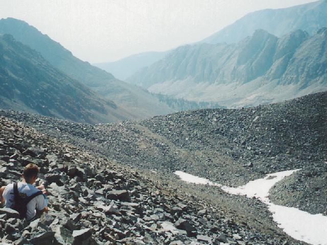 Pausing to check the moleskin, we can see the top of a sub-saddle. You can see has a snow field at its bottom. It is an amazing morning, time seems to move rather slowly, we make steady progress.