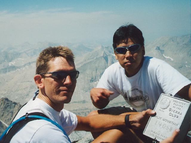 I set the camera up on the summit rock and set the timer for this shot. This is the summit log box and the view toward the Southwest from the summit of Split Mountain, 14,058 feet above sea level. The smoke seems to clear some throughout the day.